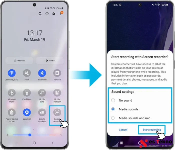 Anda dapat memilih untuk merekam audio dari sumber internal perangkat Anda, seperti suara dari game atau aplikasi, atau menggunakan mikrofon eksternal untuk merekam suara Anda sendiri secara bersamaan.