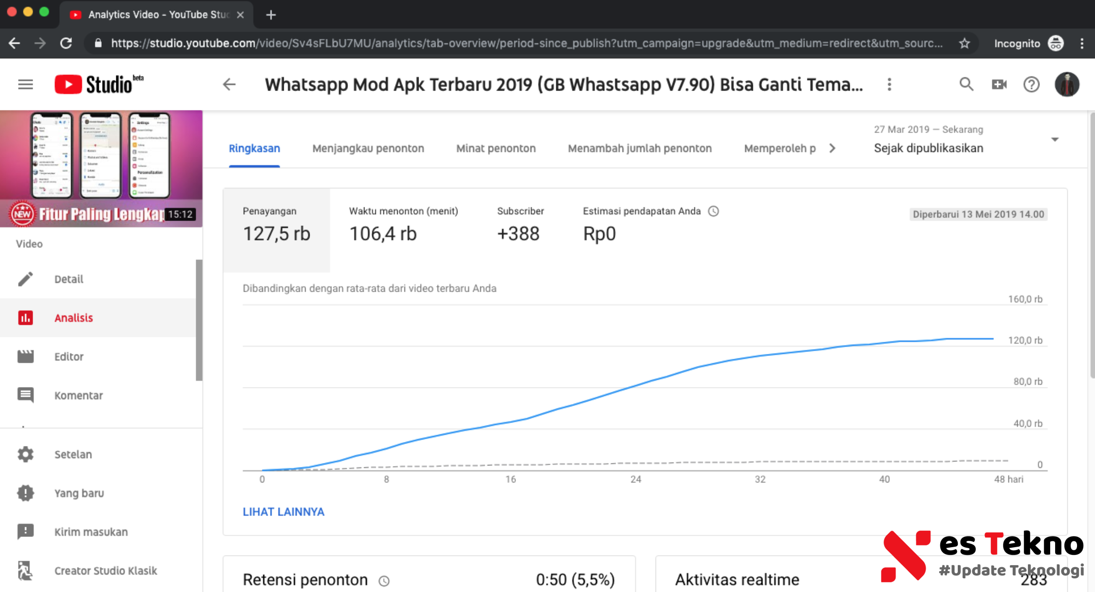 Sehingga untuk hasil dari 1 video yang sudah admin buat ini mendapatkan 127,5rb tayang, 1006,4 rb menit tontonan, 388 subscriber, Dalam waktu 1 bulan.