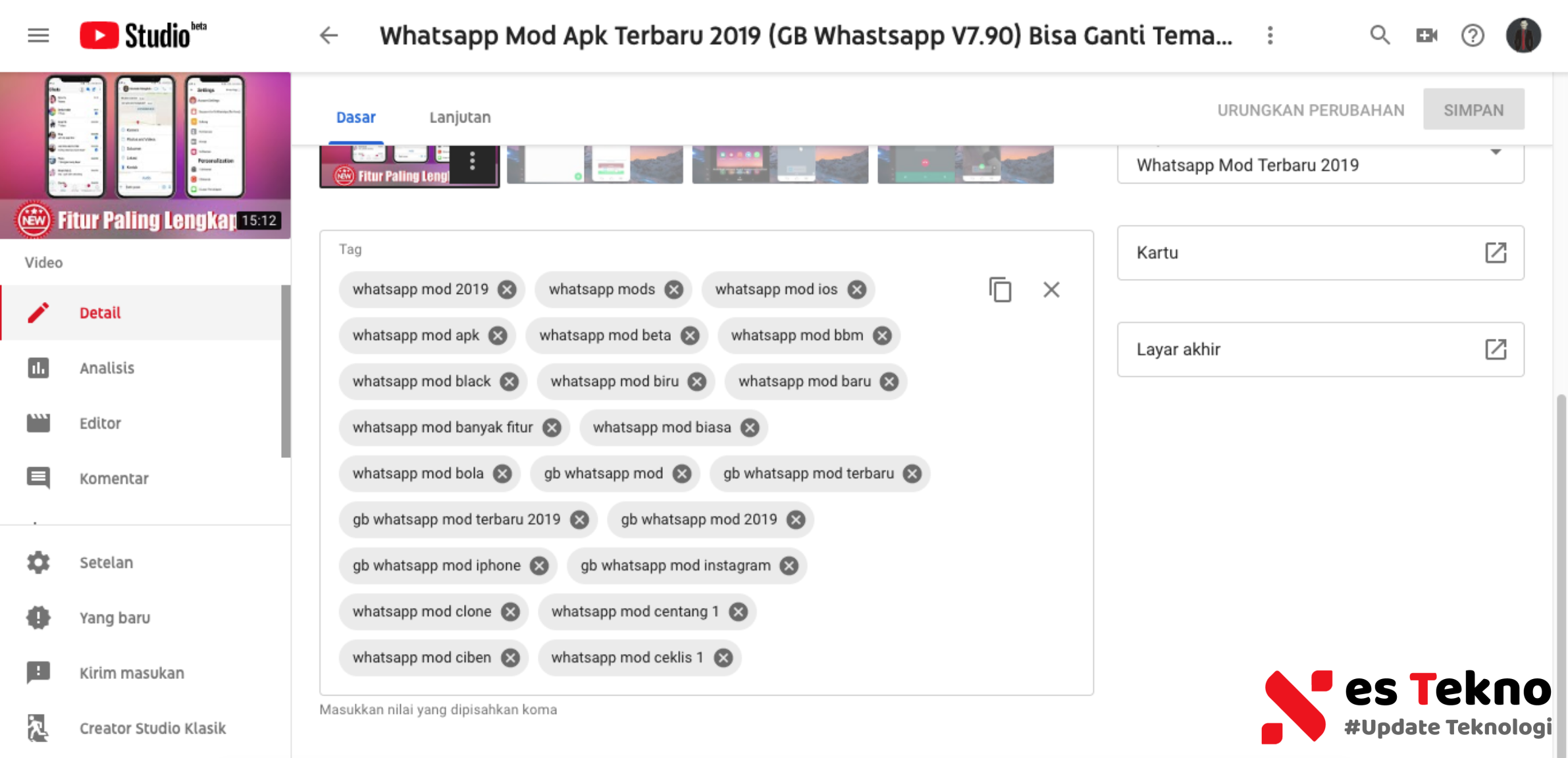 Cara Optimasi SEO Video Youtube menggunakan tag – Pada bagian tag video jangan sampai kosong, dikarenakan jika semisal pengguna mencari video di youtube dengan keyword whatsapp mod tidak ditemukan. Maka tag ini yang akan menggantikan peran dari judul sehingga video anda yang akan tampil dikarenakan tag yang mendukungnya